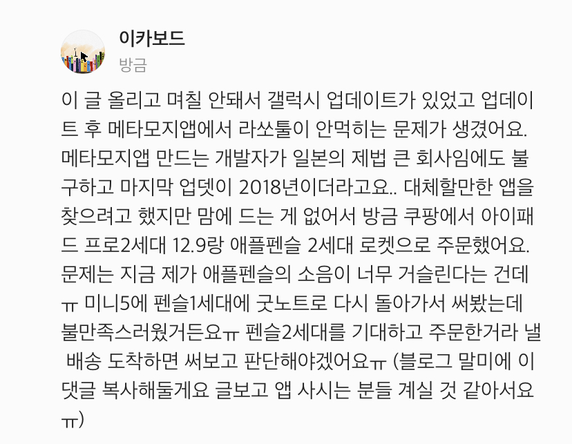 단.. 비교대상이었던 기기는 제 주력기기가 프로 1세대였기에, 현재는 구형인 기기임을 감안하셔야 합니다. 하지만 제 생각에 필기 환경이라는 점에 있어서 근본적으로 큰 차이는 없을 것 같긴 해요. 아 물론 그림을 전문적으로 그리시거나 영상을 편집하거나 할 경우 이야기는 또 달라집니다. 제 비교는 어디까지나 PDF 파일에 필기를 하는 환경을 전제하고 있어요.